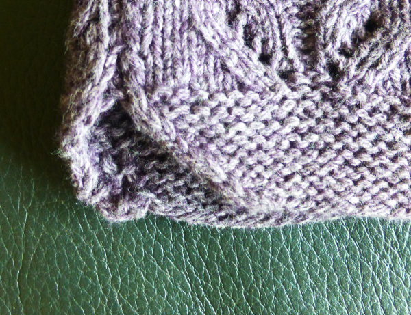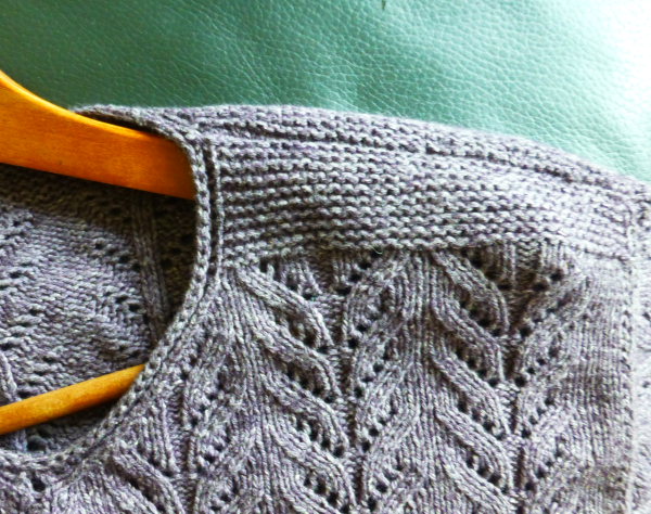 Das Muster hat sich so gut gestrickt, wie ich es nach der Maschenprobe vermutet habe: schön einfach und ohne ständiges Schauen auf die Mustervorlage. Der Pulli selbst hat ein paar witzige Beaonderheiten: er ist zum einen schön weit und lässig geschnitten und hat auch ganz weite Armausschnitte mit zwar kürzerer Amlänge, dafür aber großer Armbreite. Es gibt nette abgerundete Kanten und natürlich hängende Schultern durch verkürzte Reihen.