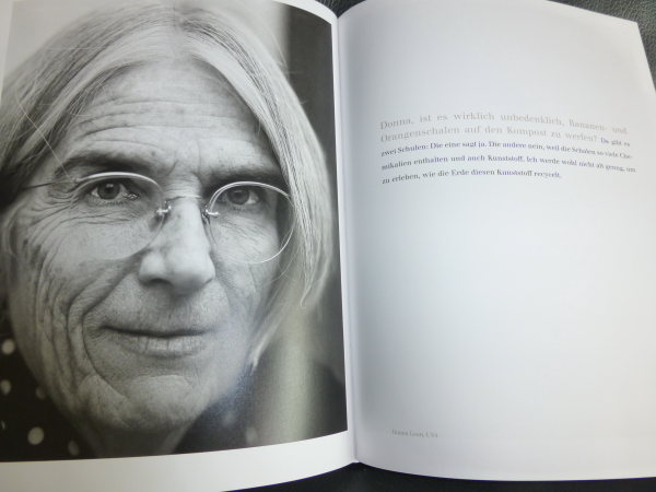 Und blättert man durch das Buch, schaut die Porträts auf der linken Seite an, liest die Frage und die Antwort auf der rechten Seite, so entsteht ein ganz eigenartiger Sog: Denn durch die Art der Fotografie, durch das Betonen der Augen, nimmt man als Leser selbst ganz intensiven Blickkontakt zu den Fotografierten auf, gerade so, als würde man ihnen am Tisch gegenübersitzen, mit ihnen ins Gespräch vertieft. Gerade so, als hätte man selbst die Frage gestellt und bekäme nun dazu die Antwort. Und das ist die dritte Ebene des Experimentes, die nun auch den Leser mit einbezieht, ihn fast aktiv an dem Prozess teilhaben lässt.