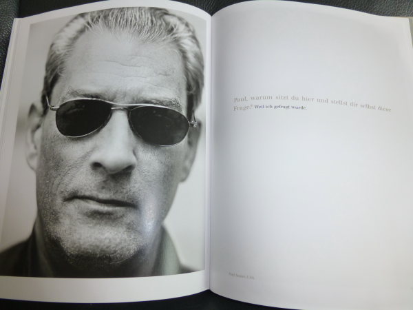 Zum einen sind bei diesem Fotoshooting mit der fast altertümlich wirkenden Technik, ganz intensive Porträts der 77 Schriftsteller herausgekommen. Sie alle schauen geradewegs in die Kamera und der Fokus liegt auf der Augenpartie, die scharf ist, während alle Bereiche des Gesichtes, die weiter vorne und weiter hinter den Augen liegen, unscharf werden. Dass der Blickkontakt, der unverstellte Blick auf die Augen, eine ganz wichtige Funktion beim Gespräch hat, wird spätestens dann klar, wenn man auf die Seite Paul Austers blättert. Er hat sich dem Experiment mehrfach verweigert. Erst der Überredungskunst seiner Frau Siri Hustvedt ist es zu verdanken, dass er sich doch darauf eingelassen hat – aber halbherzig oder auch: sich schützend, denn er hat die Sonnenbrille beim Porträt aufgelassen und so geht beim Blick in sein gesicht ganz viel Nähe verloren. Die meisten der Porträtierten schauen übrigens ganz ernst in die Kamera, denn sie müssen sich konzentrieren, zum einen auf den ruhigen Blick, zum anderen auf die Frage, die sie sich noch ausdenken müssen. So sind schon einmal – erster Teil des Experimentes – ganz besondere Fotos herausgekommen.