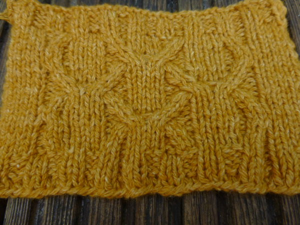 Und weil ich schon das nächste Projekt plane, habe ich zwischendurch schon eine weitere Coast-Maschenprobe angefertigt. Es soll nun einen Cardigan geben mit Zopfmuster, entweder das Modell Shadow aus der Brooklyn-Tweed Kollektion oder den Burrard von Glenna C.