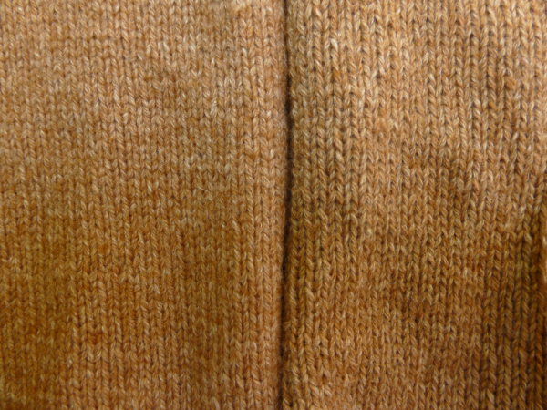 Wie die Wolle vor und nach der Wäsche aussieht, könnt Ihr auch gut auf dem folgenden Foto sehen (links nach der Wäsche, rechts vorher). Wenn man genau schaut, ist zu erkennen, dass zum einen die Farbe noch etwas ausblutet und heller wird und sich zum anderen ein sehr schönes, gleichmäßiges Maschenbild ergibt. Und es ist auch sehr schön der melierte Farbcharakter der Wolle zu erkennen. Der untere Teil des Bildes zeigt übrigens am besten die „richtige“ Farbe:
