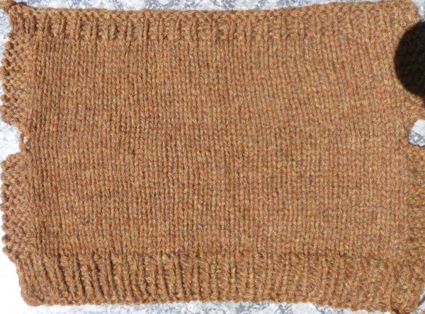 Das untere Teil der Maschenprobe habe ich – bei doppeltem Faden – mit 3,25 er Nadeln gestrickt, dann ergeben 24 M 10 cm.
