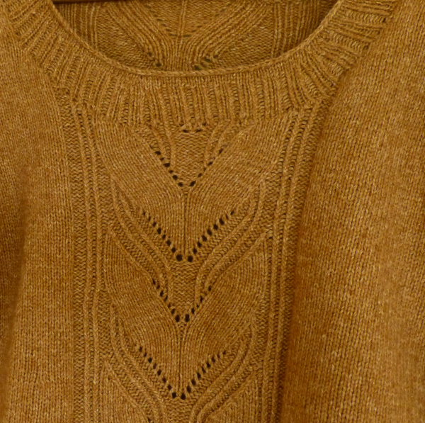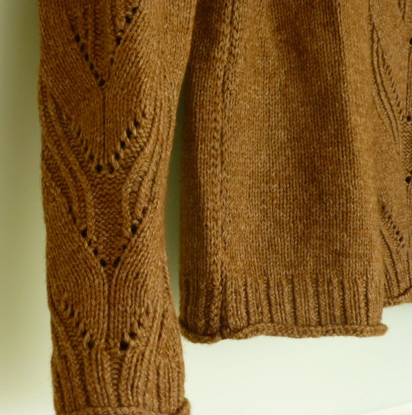 Und die Anleitung hat ganz hervorragend geklappt. Zwar habe ich alles umrechnen müssen, weil meine Maschenprobe gar nicht zur Anleitung passte, trotzdem konnte ich genau das tun, was in der Anleitung stand, halt nur mit meinen anderen Maschenzahlen. So habe ich zum Beispiel auch das Muster auf Vorder- und Rückenteil um ein paar Maschen verbreitert und das ursprüngliche Muster für die Ärmel genommen. Die leichte A-Form des Pullis mag ich sehr und der weite Halsausschnitt passt auch sehr gut zum Modell. Und was das Muster betrifft, so sind einfach die gedrehten rechten Maschen der Clou, denn so entsteht zum einen das interessante Bündchenmuster, zum anderen die Rippen im Blattmuster. Aber: beim Stricken halten diese Maschen total auf.