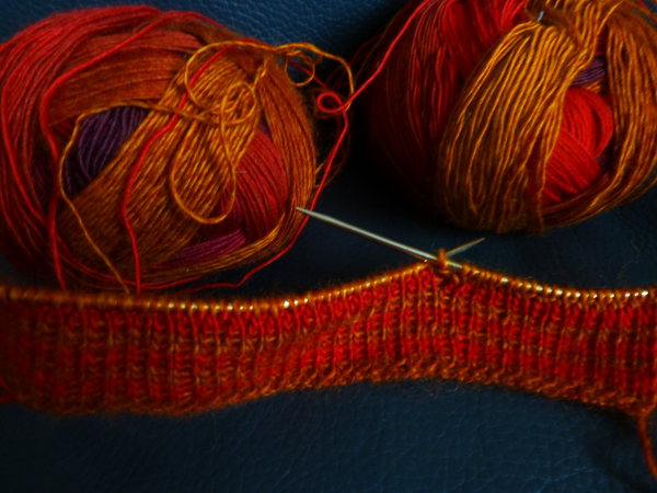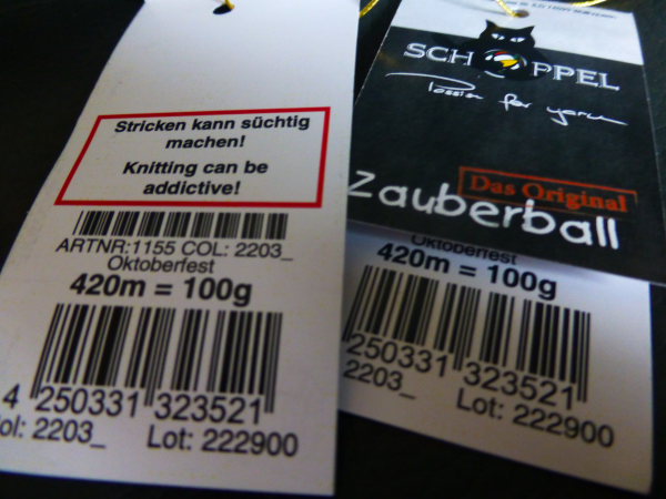 „Banderolen“ mit Katze und Warnhinweis vor den Gefahren des Strickens hat. Zum anderen, und noch viel wichtiger, liefern die Zauberbälle, die eigentlich zum Sockenstricken gedacht sind, beim Stricken von selbst wunderbare Farbverläufe. Und wenn zwei Zauberbälle miteinander kombiniert werden, entweder zwei derselben Farbe oder auch unterschiedlicher Farben, und jeweils nach zwei Reihen eines Knäuels gewechselt wird, dann kommen dabei noch spektakulärere Farbverläufe heraus. Auch auf meinem Header ist so ein Schal in der – leider nicht mehr lieferbaren – Farbe „Schokoladenseite“, ihr könnt ihn ganz knapp über dem Sofarücken baumelnd sehen.
