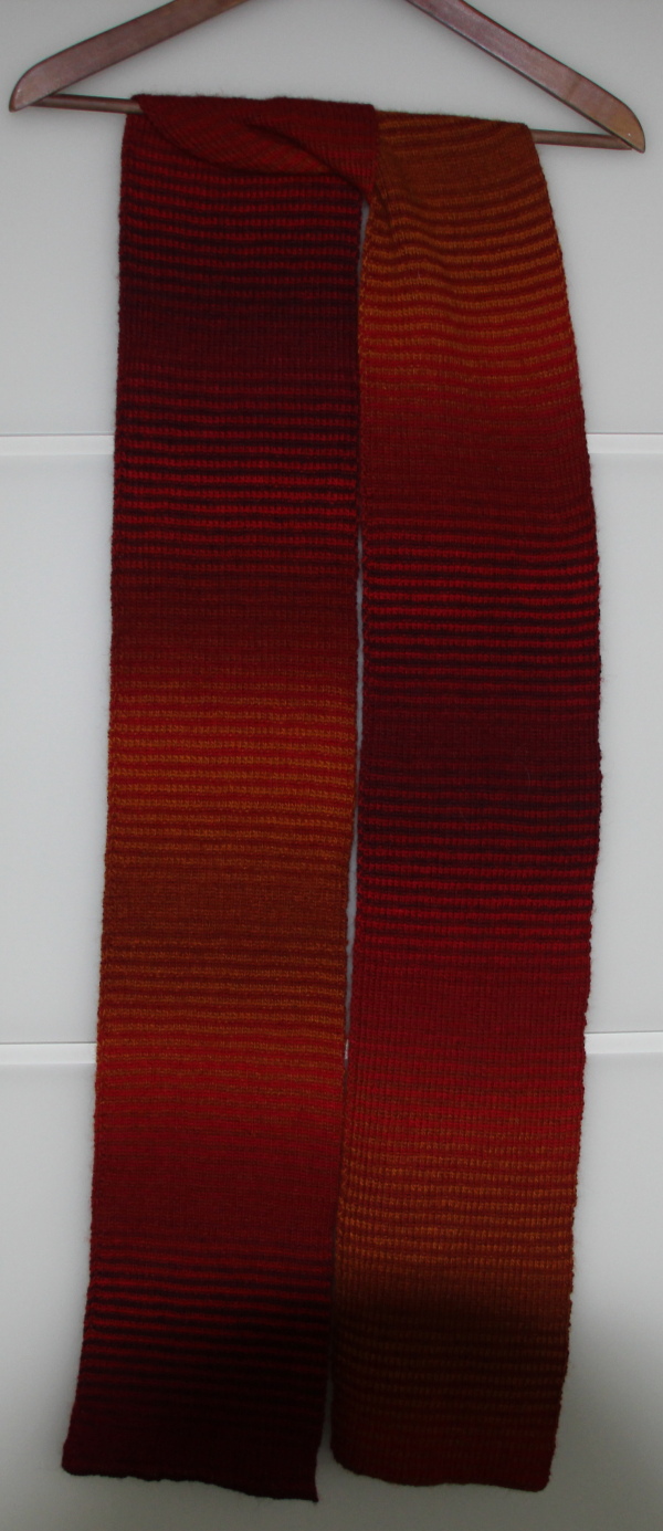 Nun ist er fertig der einfach zu strickende, weil locker von der Hand gehende Winterschal aus wunderbaren Orange- bis Rottönen. Passend zum kalten Wind aus dem Norden (ob wohl heute schon Schnee kommt?) kann ich also mit warmem Hals in den sonnigen Nachmittag starten. Und bei dem Farbspiel des Schals kann ich mich durchaus zu dem immer noch reichlich an den Bäumen hängenden und so schön leuchtenden Herbstlaub gesellen.