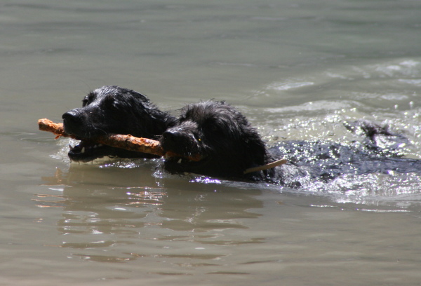 oh, dann herzlich willkommen zurück in der digitalen Welt. Ich hätte es ja gar nicht so lange ausgehalten… Das Apportierbild habe ich beim Bildersuchen wiedergefunden. Gemeinsam mit Stock zu laufen, haben die Jungs gerne gemacht, als sie noch viel jünger waren. Gemeinsam am Stock zu schwimmen schon seltener. Und über das Stöckchenaufheben – wenn Ihr Lust und Zeit habt – würde ich mich freuen.
