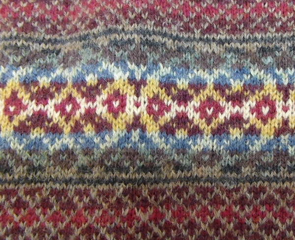 Verstrickt habe ich Isagers schottische Hochlandwolle, die es nun schon gar nicht mehr gibt. Sie ist schön dünn (dadurch dauert die Strickerei natürlich ewig) und bietet sich deshalb zur Vielfarbstrickerei an, ohne dass man eine doppelfädige Jacke für polare Eiszeiten bekommt :-). Sie ist aber trotzdem so fest, dass es auch bei Nadelstärke 2,5 kein durchsichtiges Strickstück wird – ein echter und gar nicht mal selbstverständlicher Vorteil des Garnes, wie ich jetzt bei der einfädigen Strickprobe von Holst Noble-Garnen gemerkt habe.