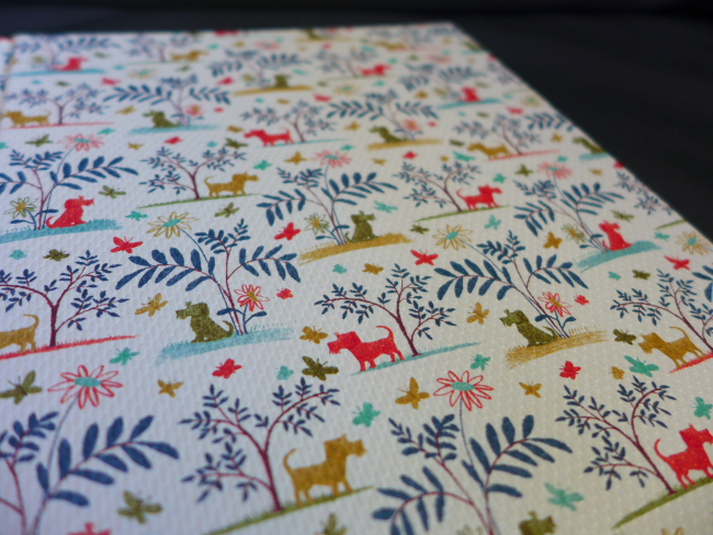 einmal in die Hundepfote zu gelangen und von der Hundekralle aufgeschlagen zu werden. Es hat ja nicht nur den sehr haltbaren Umschlag. Es hat vor allem auch einen sehr festen Einband, der ganz wunderbar gestaltet ist mit vielen roten und grünen Plums (diese Gestaltung könnt Ihr auch schon auf dem Blog bestaunen). Da können selbst wir Hundejungs uns das Buch immer mal wieder ins Körbchen holen (ja, stimmt, manchmal lesen wir es auch auf dem grauen Sofa) und vor und zurückblättern: Davon sieht man bisher nichts.