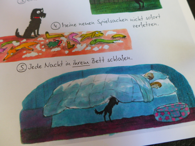 Manchmal begleitet Plum Emma zu ihrem Verlag (das ist dann die Arbeit), manchmal auch zu Lesungen. Zwar sind ihr die Geschichten von blauen Kängurus ganz furchtbar peinlich, mal abgesehen davon, dass sie sie schon mindestens tausend Mal gehört hat und auch einem Hund schon mal langweilig wird, aber sie sieht ja auch ein bisschen ihre Anwesenheit als Aufgabe, denn schließlich muss sie „die Kinder mit Blinzelspielen bei Laune halten“ (das kennen wir auch gut, wenn wir ab und zu – ganz selten, ach: viel zu selten – abends mit in die Menschenschule gehen dürfen. Das ist so toll, so viele, die uns bekuscheln wollen, so viele, die mit uns spielen wollen – obwohl die alle schon ganz erwachsen sind. Aber auch dann wird es uns irgendwann langweilig, weil die Studierenden ja den ganzen Abend ganz ruhig sitzen müssen und sich über merkwürdige Dinge unterhalten, die keinen Hund der Welt interessieren. Dann schlafen wir einfach ein bisschen.).