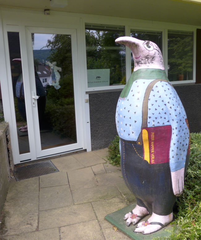 Der kleine unabhängige Verlag residiert in einer Souterrain-Wohnung, die aber, ganz typisch für manche Viertel Wuppertals, obwohl halb im Keller, doch so hoch auf dem Hügel liegt, dass sie wiederum wunderbare Weitblicke auf den gegenüberliegenden Hügel ermöglicht. Vor der Tür begrüßt den Besucher kein Maulwurf, sondern ein Pinguin, der aus der Pinguinale von 2006 stammt, einer Aktion zum 125-jährigen Bestehen des Wuppertaler Zoos, die dazu führte, dass sich plötzlich überall im Stadtbild viele lustig bemalte Pinguine zeigten.