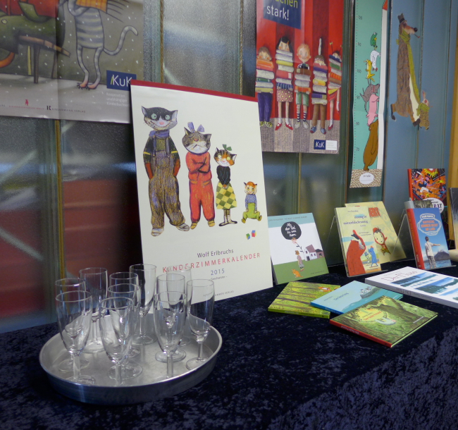 Claudia Putz, die im Verlag die Presse betreut, stellte uns dann mit großer Begeisterung drei neue Kinderbücher vor. Die „Fünferbande“, eine Geschichte um die fünf Finger einer Hand, die auf einmal ihre Doppelgänger kennenlernen, nämlich die fünf Finger der anderen Hand. Und schon entsteht ein großer Streit, gar ein „Handgemenge“, das sich erst löst, als ein Vogel sie beschmutzt und sie merken, dass sie nur gemeinsam eine Lösung finden können. Und die Gutenacht-Geschichten rund um den kleinen Löwen und den kleinen Clown, die abends im Circus auftreten, tagsüber aber eine Menge Abenteuer zu bestehen haben, wenn der kleine Löwe nämlich beispielsweise nichts mehr sieht, weil seine Haare so lang geworden sind und der kleine Clown ihn zum Friseur bringt. Zum Schluss haben wir noch „Kleopatra“ kennengelernt, eine wild grinsende Tüpfel-Hyäne, die aus dem Zoo ausgebüxt ist und nun in einem blauen Fass auf der Müllkippe lebt. Dort findet sie genügend Essen und viele interessante Dinge, die sie in ihrem Laden verkaufen möchte. Und immer wieder träumt sie von einem merkwürdigen Land mit fantastischer Sonne und heißen Winden.